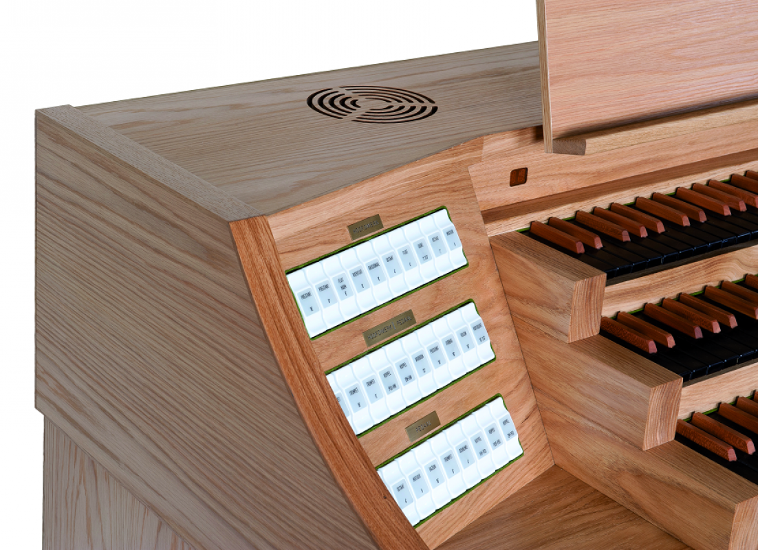 - Erweiterungsmöglichkeit mit einer Registerbibliothek von 64 Registern (Änderung der Standard-Disposition auf 46 + je Manual + Ped. 2 frei, aus der Bib.belegbare Register)