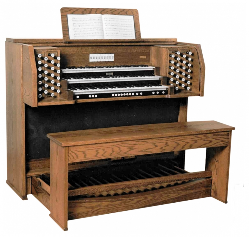 • Notenpult ausziehbar (Entfernung zum Organisten verkürzbar)